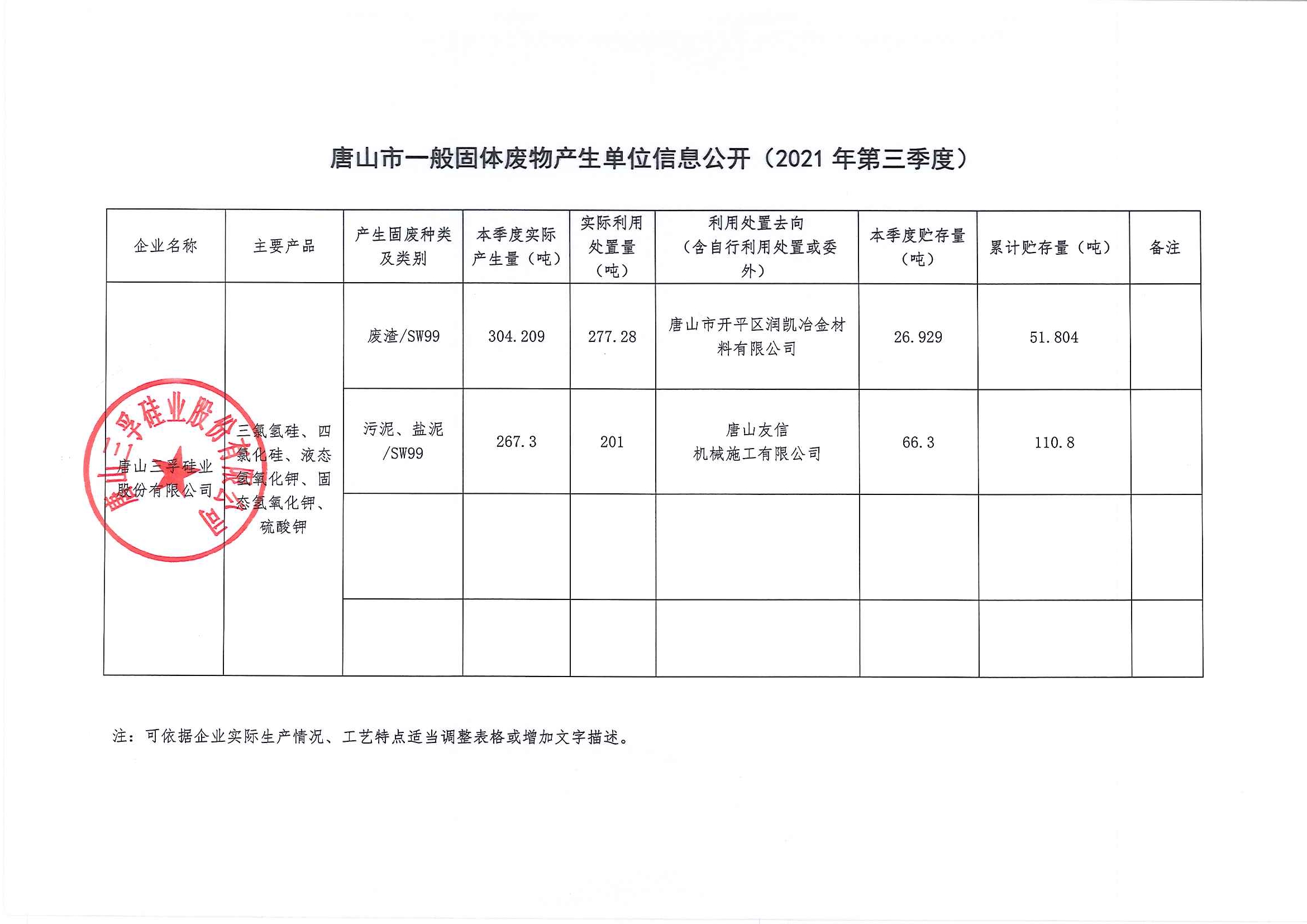 唐山三孚硅業(yè)股份有限公司 危險廢物 三季度信息公開