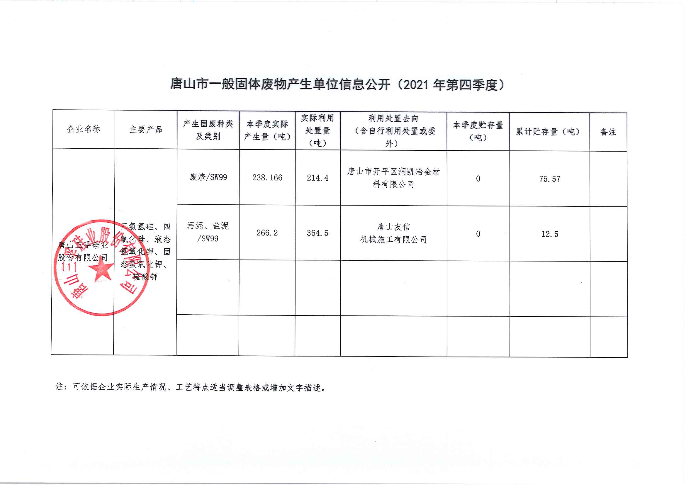 唐山三孚硅業股份有限公司2021年四季度一般固體廢物廢物信息公開