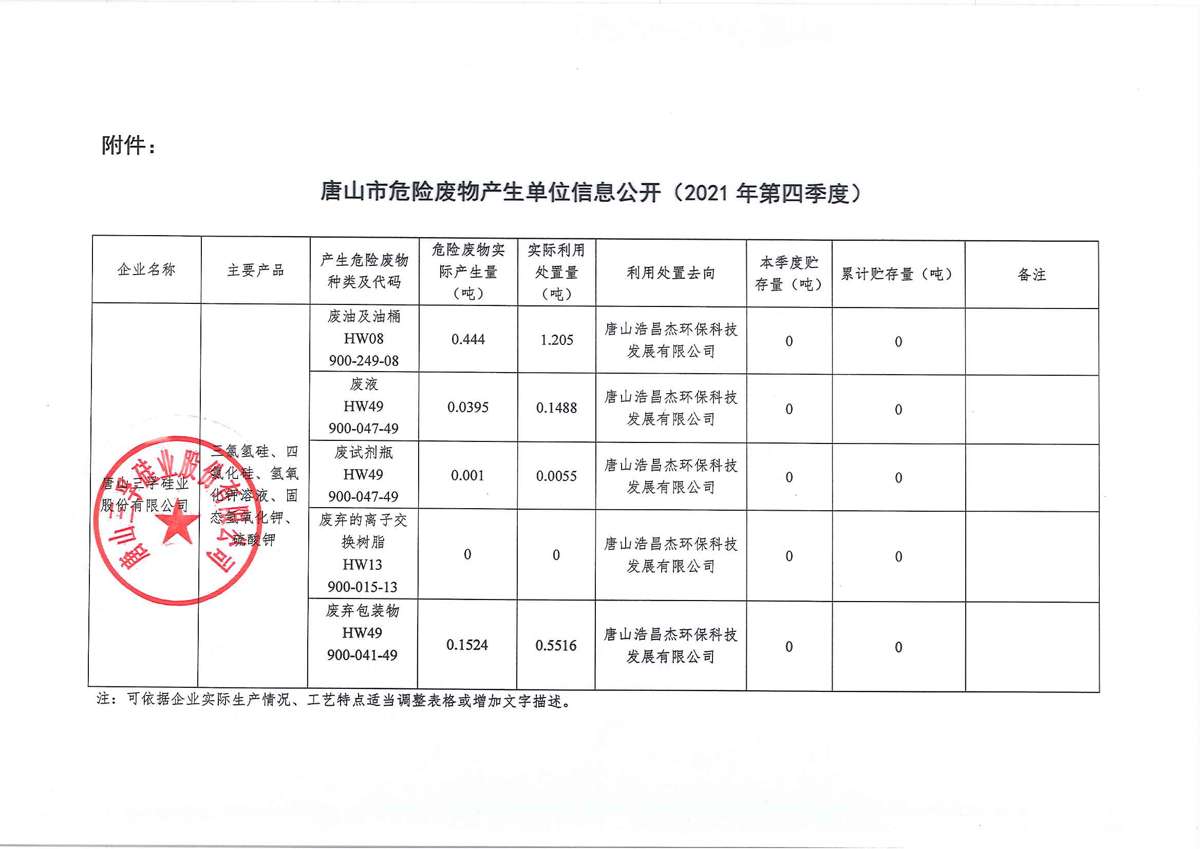 唐山三孚硅業(yè)股份有限公司2021年四季度危險(xiǎn)廢物信息公開