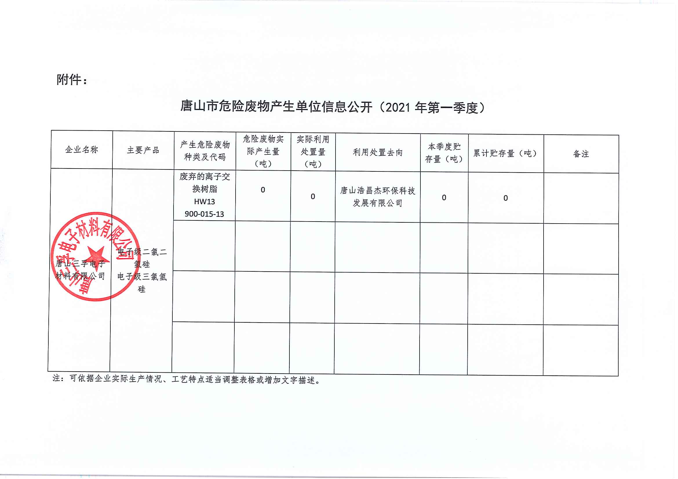 唐山三孚硅業股份有限公司2021年1季度 危險廢物產生單位信息公開