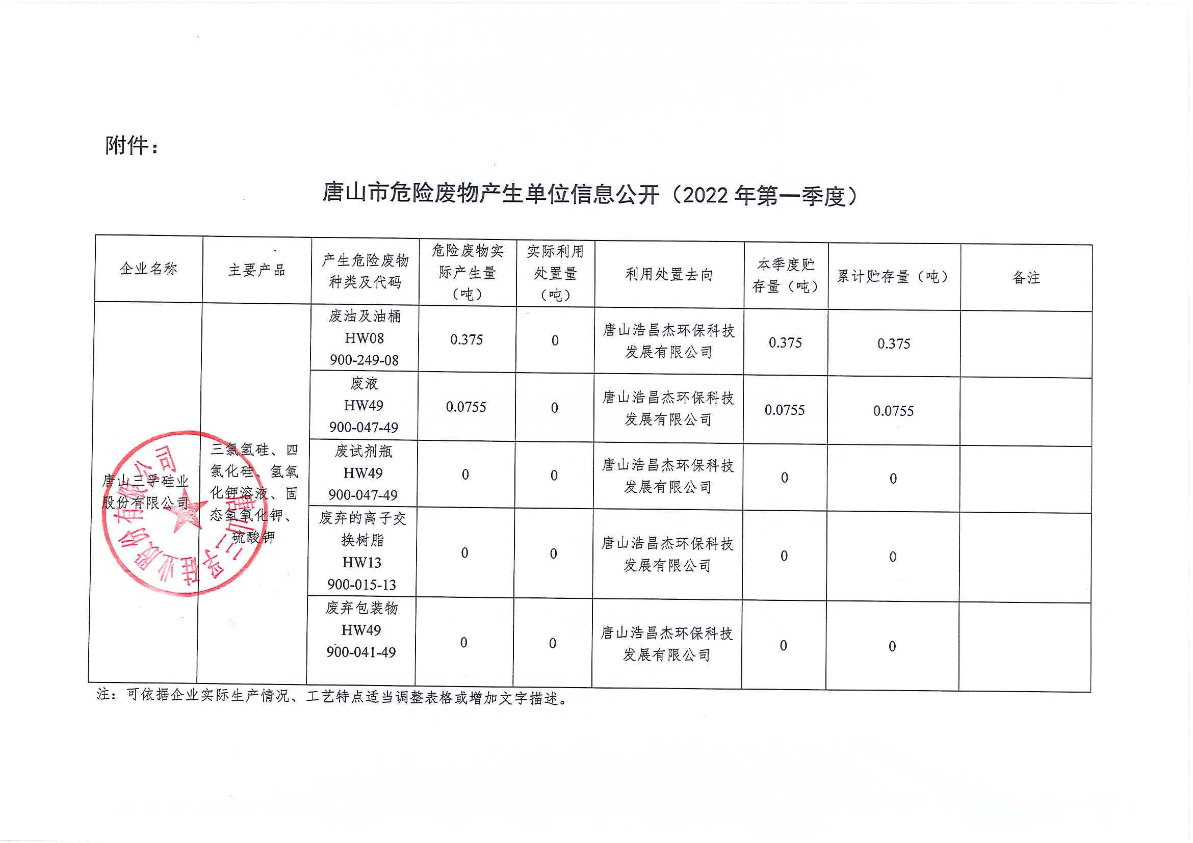 唐山三孚硅業(yè)股份有限公司2022年一季度危險(xiǎn)廢物信息公開(kāi)