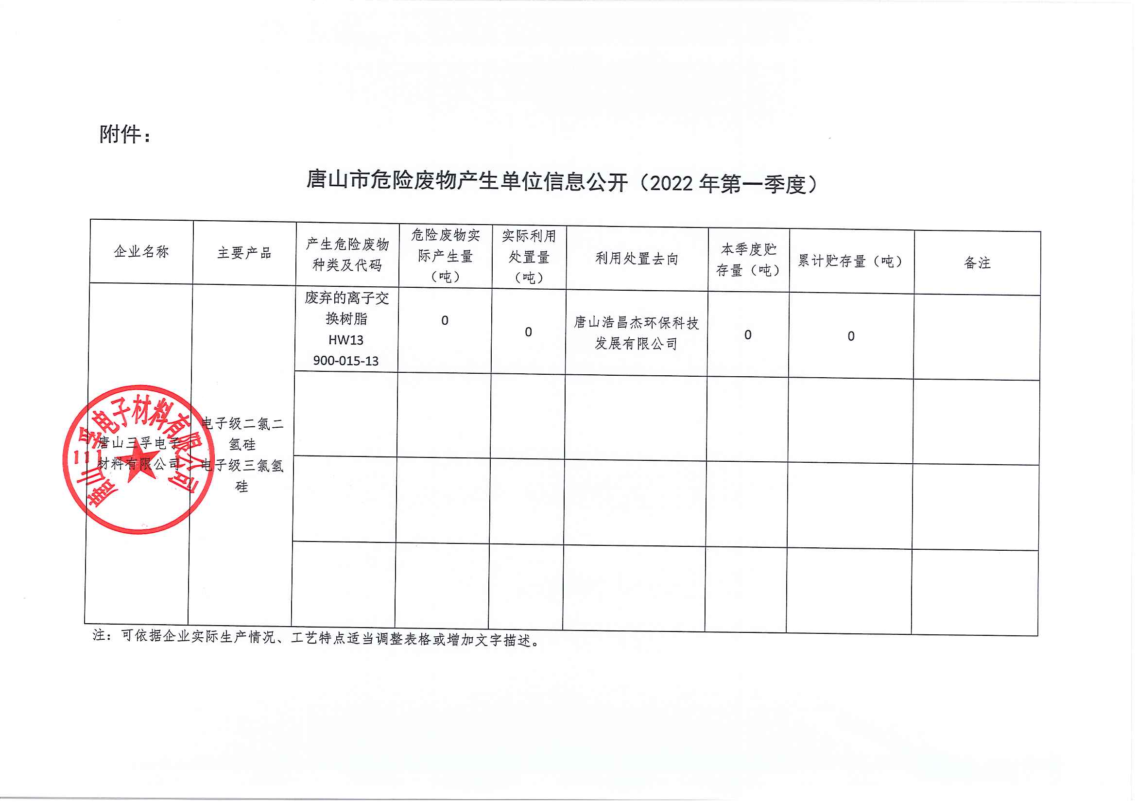 唐山三孚電子材料有限公司2022年一季度危險廢物信息公開