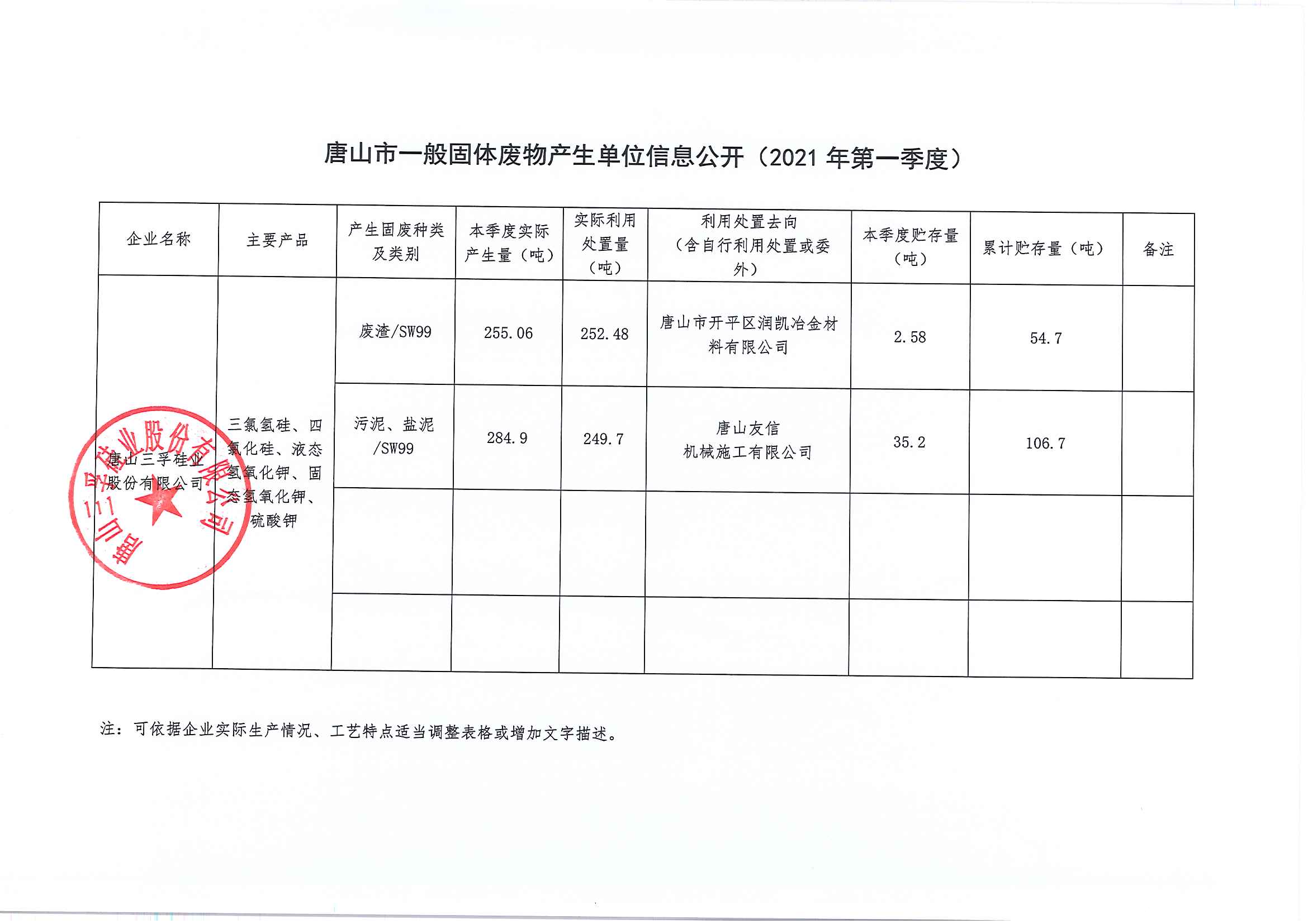 唐山三孚硅業(yè)股份有限公司2021年1季度 一般固體廢物產(chǎn)生單位信息公開